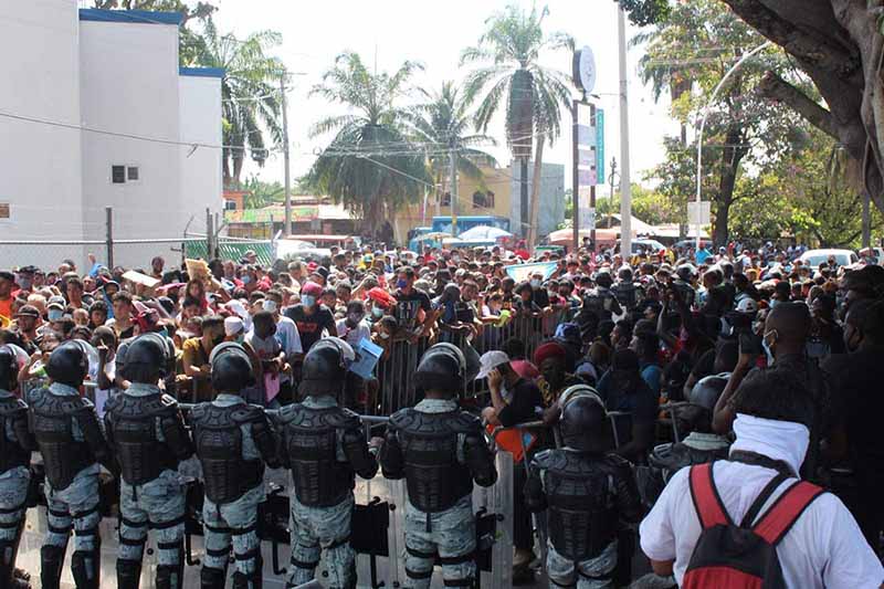 Tapachula, Chiapas; 14 de Febrero del 2022.- Elementos de la Guardia Nacional (GN) con equipos antimotines y policías, intentaron contener a miles de indocumentados de al menos 17 países que llegaron de manera masiva este lunes a las oficinas migratorias para buscar visas humanitarias.