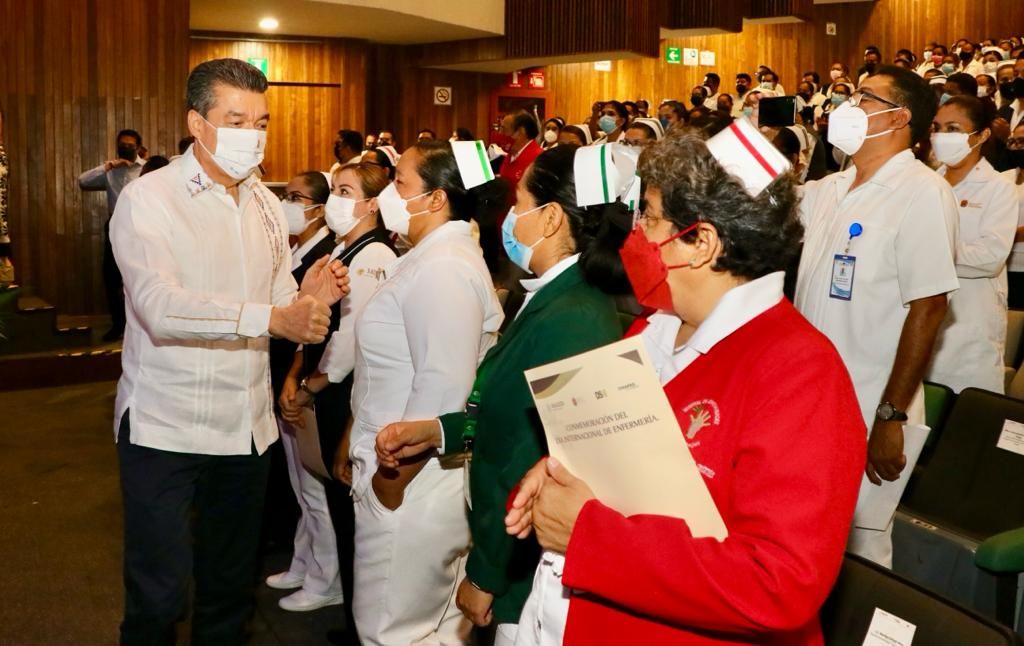 “Es un gran honor asistir a este acto tan significativo para las enfermeras y los enfermeros de Chiapas. Estamos aquí para reconocer a las personas que hacen todo lo posible y ponen el corazón para fortalecer y sacar adelante su labor, sobre todo para atender sin distinción a las personas que sufren alguna enfermedad u otra condición que pone en riesgo su vida. Sigamos enalteciendo el himno de las y los enfermeros, que nos convoca a forjar un mundo saludable, con servicio, entrega y valor”, apuntó.