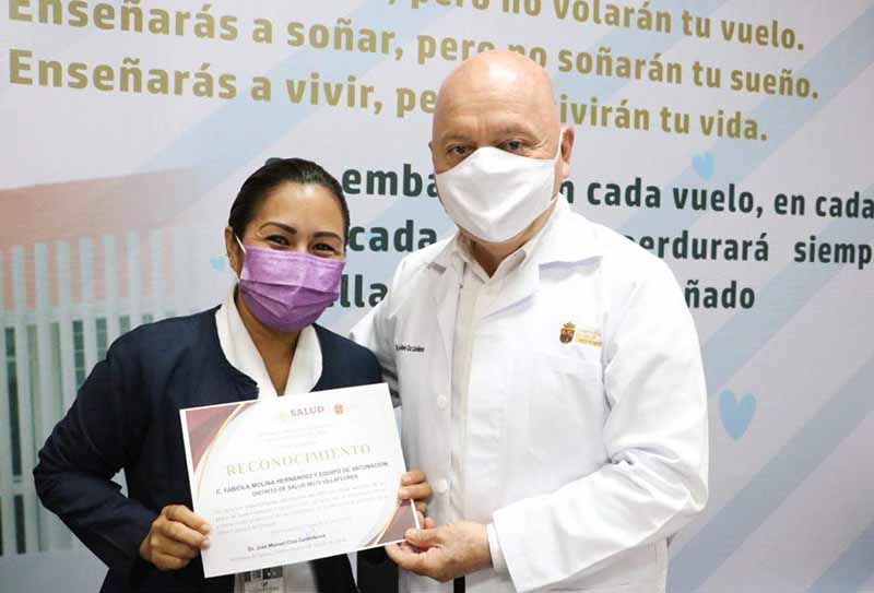 En reunión de trabajo con personal de la Subdirección de Programas Preventivos y responsables de Vacunación y Red de Frío a nivel estatal, el doctor Pepe Cruz hizo entrega de reconocimientos a los responsables de vacunación de los Distritos de Salud que lograron cumplir y fortalecer los esquemas de vacunación al 100 por ciento en niños y niñas en el cierre de 2021 y en lo que va de este año.