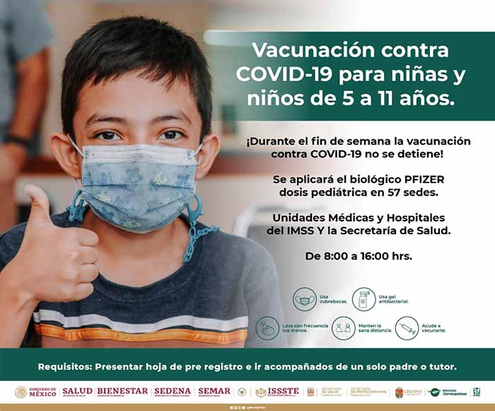 Durante este sábado 2 y domingo 3 de julio, en Chiapas se abrirán 57 módulos para la vacunación a niñas y niños de 5 a 11 años y 11 meses de edad, misma que inició en el estado desde el pasado lunes.