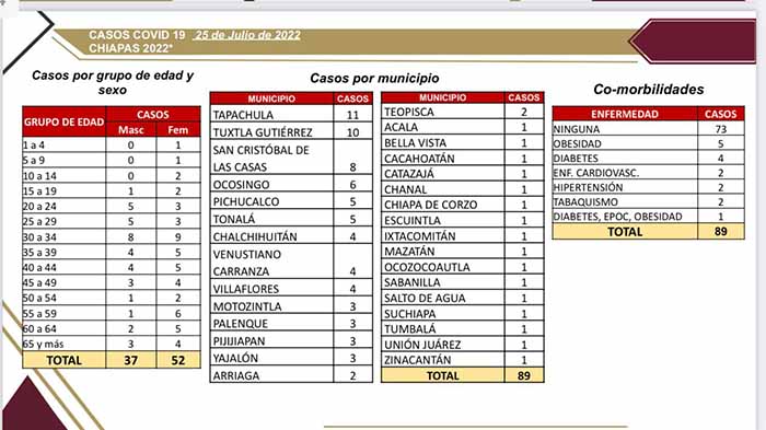 Tuxtla Gutiérrez, Chiapas; 25 de Julio del 2022.- La Secretaría de Salud del Estado anunció que en las últimas 24 horas, de acuerdo al panorama epidemiológico, se notificaron 89 casos positivos de COVID-19, sin registro de defunciones por esta enfermedad respiratoria.