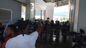 Huixtla, Chiapas; 27 de julio de 2022.- Alrededor de las 13:10 horas de este miércoles, más de 4 mil migrantes que permanecían frente a las instalaciones de la caseta aduanal de “Cerro Gordo”, kilómetro 240 de la carretera que conduce de Huixtla a Villa Comaltitlán, se enfrentaron a la Guardia Nacional, tomaron el control y bloquearon la entrada y salida del edificio.