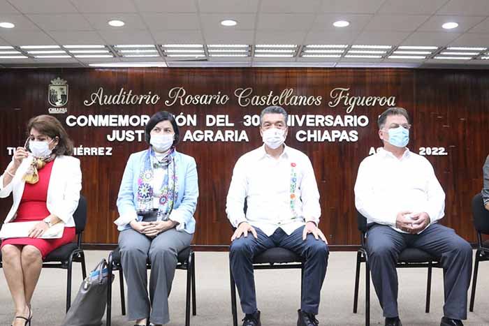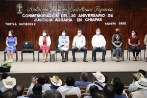En la conmemoración del 30 aniversario de Justicia Agraria, el gobernador Rutilio Escandón Cadenas destacó que la creación y consolidación de los tribunales agrarios en el país, ha constituido un paso fundamental en la atención y resolución de controversias en esta materia, así como para proteger los derechos y brindar certeza jurídica, de manera igualitaria, a las mujeres y los hombres que trabajan y viven en el campo chiapaneco y mexicano.