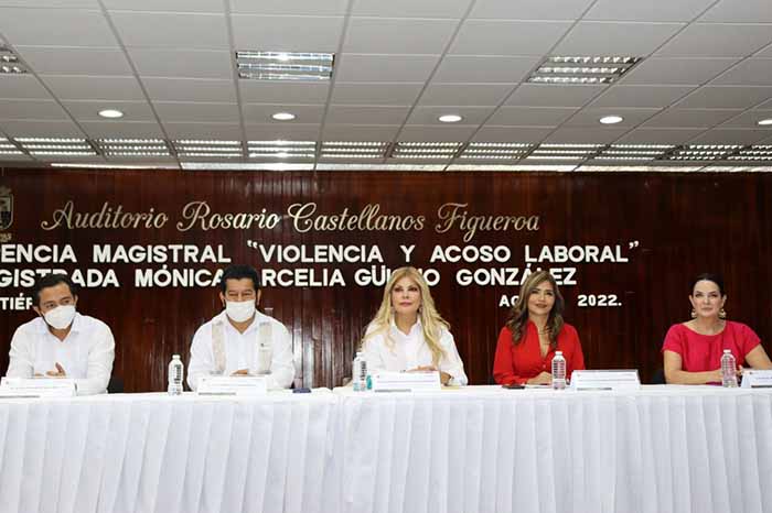La Secretaría General de Gobierno, que dirige Victoria Cecilia Flores Pérez, en coordinación con el H. Congreso del Estado de Chiapas a través de la Comisión Editorial y de Relaciones Públicas, que preside la diputada Rocío Cervantes Cancino, realizaron la conferencia magistral “Violencia y Acoso Laboral” impartida por la magistrada Mónica Güicho González, representante del Gobierno Federal del Tribunal Federal de Conciliación y Arbitraje y Presidenta de la Comisión de Igualdad y Derechos Humanos, en dicho evento se cumplió con el objetivo de concientizar y visibilizar estas problemáticas que sufren mujeres y hombres en el campo laboral.