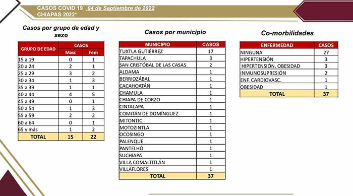 Tuxtla Gutiérrez, Chiapas; 04 de Septiembre de 2022.- El panorama epidemiológico de COVID-19 indica que en las últimas horas se detectaron 37 casos en 18 municipios de la entidad, comunica la Secretaría de Salud de Chiapas.