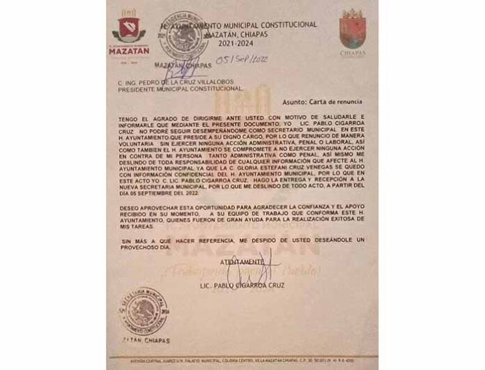 Tapachula, Chiapas; 07 de Septiembre del 2022.- A través de un escrito entregado el lunes, presentó su renuncia, Pablo Cigarroa Cruz, quien se desempeñaba hasta esa fecha como titular de la secretaría del municipio de Mazatán, colindante con Tapachula.