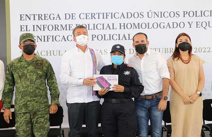 El secretario ejecutivo del Sistema Estatal de Seguridad Pública, Sergio Alejandro Aguilar Rivera, señaló que en esta administración, se ha invertido casi mil millones de Pesos en el rubro de seguridad en esta región; dijo que, además de uniformes, equipos y certificados, las tabletas que se entregan son para mejorar el Informe Policial Homologado, ya que Tapachula fue elegido a nivel nacional para un plan piloto sobre la aplicación de este reporte.
