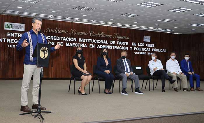 En este marco, el mandatario también atestiguó la entrega al IAP Chiapas de la acreditación de los Comités Interinstitucionales para la Evaluación de la Educación Superior (CIEES), donde resaltó que dicha certificación reafirma el prestigio que este instituto educativo tiene a nivel nacional, gracias a la calidad en sus programas y planes de estudios, lo que permite la formación de servidores públicos comprometidos con su entorno.