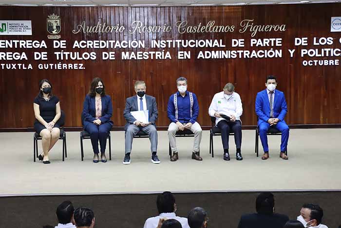 En la entrega de títulos a estudiantes egresados de la Maestría en Administración y Políticas Públicas, del Instituto de Administración Pública del Estado de Chiapas (IAP), el gobernador Rutilio Escandón Cadenas destacó la importancia de que las y los jóvenes continúen con su preparación profesional, pues esto permite formar servidores públicos más sensibles y con mayor responsabilidad en las tareas de planeación, uso del presupuesto y el impulso de políticas a favor del bienestar y progreso de Chiapas.