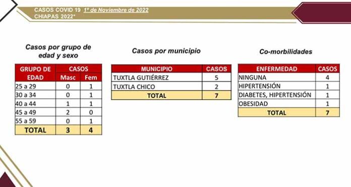 Tuxtla Gutiérrez, Chiapas; 01 de Noviembre de 2022.- Chiapas inicia el mes de Noviembre con siete casos nuevos de COVID-19, en sólo dos municipios de la entidad.