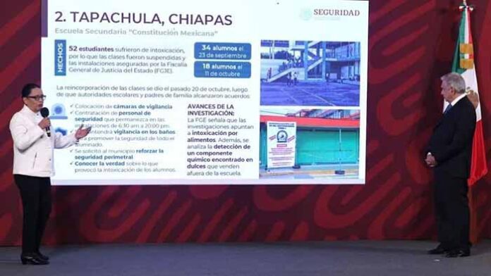 Rodríguez indicó que, en el caso de Tapachula, Chiapas, donde 52 estudiantes sufrieron de intoxicación, presuntamente fue por alimentos y se analizó un componente químico encontrado en los dulces que venden afuera de la escuela, que finalmente fue un colorante.