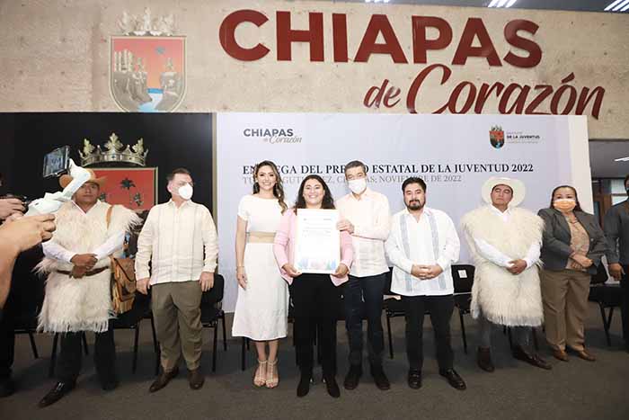 Al entregar el Premio Estatal de la Juventud Chiapas 2022, el gobernador Rutilio Escandón Cadenas sostuvo que su gobierno seguirá impulsando programas y acciones con el objetivo de fortalecer la participación e inclusión de las y los jóvenes en los ámbitos social, económico, cultural, científico y político, porque su talento, inteligencia, capacidad y creatividad son fundamentales para lograr el bienestar y la transformación de Chiapas y México.