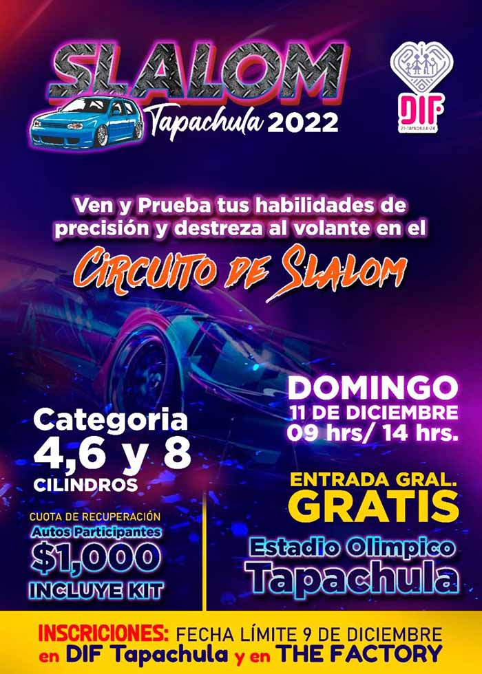 En tanto, uno de los organizadores del Slalom Tapachula 2022, Luis Enrique Gómez Dávila explicó que se trata de una competencia de tiempo donde los conductores participan por turnos una a la vez en un trazado temporal en un estacionamiento “en este caso será en el estadio Olímpico”.