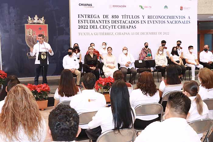 Durante la entrega de 850 títulos de especialidad a egresados del Colegio de Estudios Científicos y Tecnológicos del Estado de Chiapas (CECyTE Chiapas) de la promoción 2022, quienes se incorporarán al desarrollo profesional o se encuentran cursando el nivel superior, el gobernador Rutilio Escandón Cadenas felicitó a la comunidad estudiantil y refrendó su compromiso de seguir invirtiendo en el fortalecimiento de la educación en Chiapas.