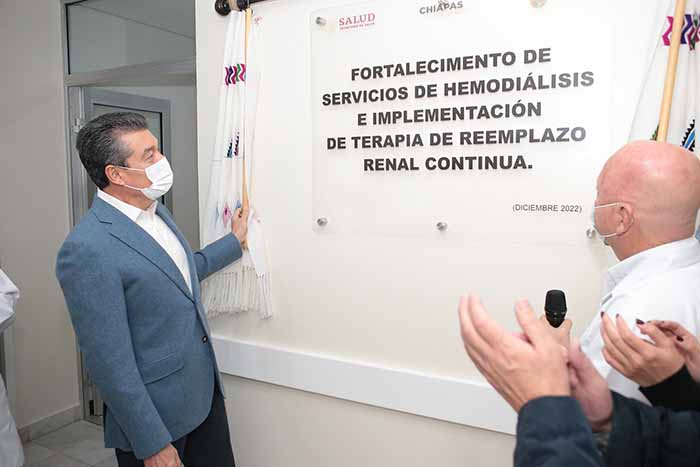 En la puesta en marcha de la Unidad de Hemodiálisis y Rayos X, y la implementación de los servicios de terapia de reemplazo renal continua en el Hospital de Las Culturas de San Cristóbal de Las Casas, el gobernador Rutilio Escandón Cadenas sostuvo que la salud es un tema prioritario, por ello se invierte en proyectos de reconversión, equipamiento y mejoramiento integral de la infraestructura hospitalaria de Chiapas, a fin de garantizar a la población servicios médicos dignos y de calidad.