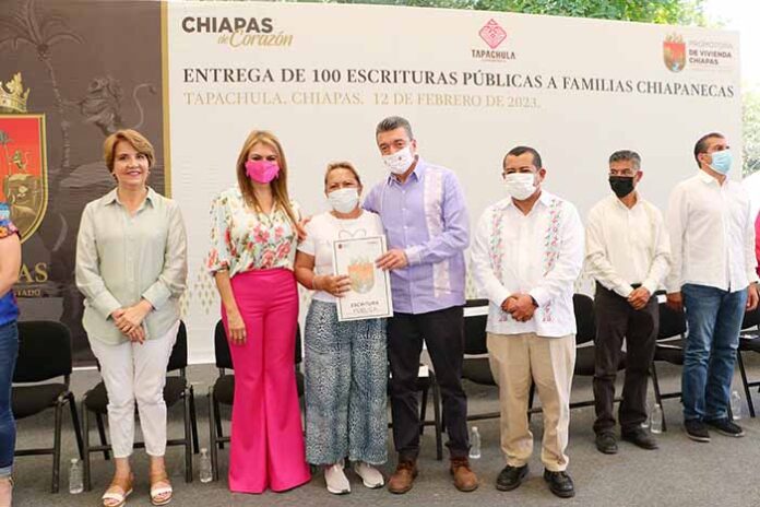 El director general de la Promotora de Vivienda Chiapas (Provich), Freddy Escobar Sánchez, informó que siguiendo las indicaciones del mandatario estatal y tras el trabajo conjunto con los Ayuntamientos de la región, tras muchos años de espera 100 familias recibieron de las manos del gobernador las escrituras públicas que dan certeza jurídica de su vivienda o propiedad. Refrendó su compromiso de seguir impulsando acciones para que más familias regresen a sus casas con la seguridad de que nadie les pueda despojar de su patrimonio.