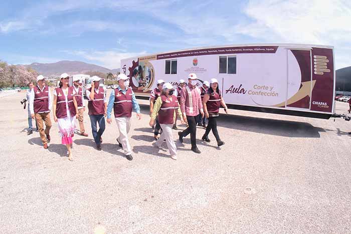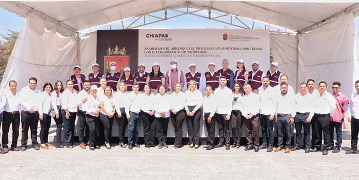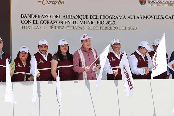 El gobernador Rutilio Escandón Cadenas dio el banderazo de arranque del Programa Aulas Móviles “Capacitando con el Corazón en tu Municipio 2023”, a través del cual se acerca la capacitación para y en el trabajo a las chiapanecas y chiapanecos que residen en lugares con mayores índices de marginación.