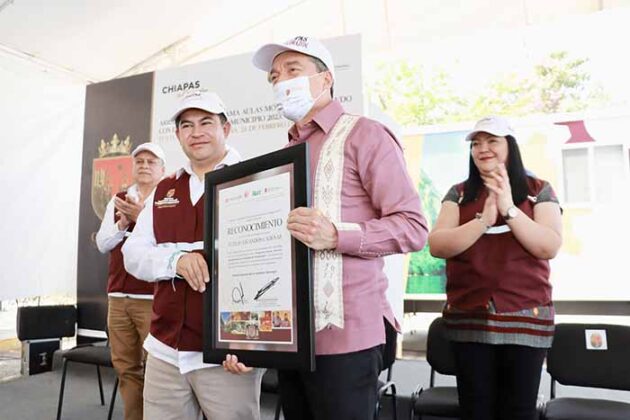 Al informar que, gracias los proyectos de Comités Regionales de Capacitación, Escuela Anticorrupción, Capacitación a alumnos del Cobach y Aulas Móviles, Chiapas es referente nacional, el director de los Centros de Formación para el Trabajo de la Subsecretaría de Educación Media Superior, Mario Hernández González, entregó un reconocimiento a Rutilio Escandón por dirigir esas tareas bajo principios de pertinencia, inclusión, calidad y equidad.