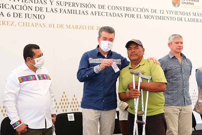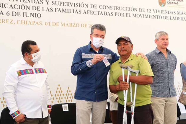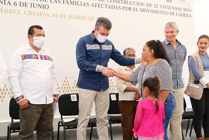 Durante la entrega de viviendas a 59 familias que en el 2013 resultaron afectadas por el fenómeno movimiento de ladera, en el ejido El Jobo de Tuxtla Gutiérrez, el gobernador Rutilio Escandón Cadenas manifestó que esto no es una dádiva ni una concesión sino una muestra del compromiso que su gobierno tiene con la justicia social y el cumplimiento del derecho a acceder a una vivienda digna y segura.