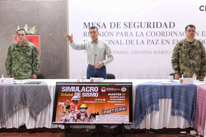 Durante la Mesa de Coordinación Estatal para la Construcción de la Paz y la Seguridad, el gobernador Rutilio Escandón Cadenas convocó a dependencias de los tres órdenes de gobierno, instituciones públicas, comercios y a la sociedad en general a organizarse y participar en el Simulacro Estatal, con hipótesis de sismo de 8.2, que se llevará a cabo el martes 21 de marzo a las 12 horas.