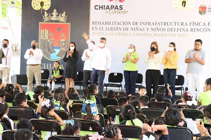 En medio de la alegría y emoción de estudiantes y docentes, el gobernador Rutilio Escandón Cadenas inauguró la rehabilitación de aulas en el Jardín de Niñas y Niños “Delfina Rincón” de Tuxtla Gutiérrez, donde expresó que se seguirá invirtiendo en mejorar los centros escolares pues es necesario contar con edificios seguros, cómodos y bonitos para la niñez chiapaneca.