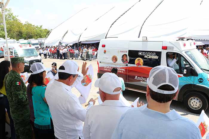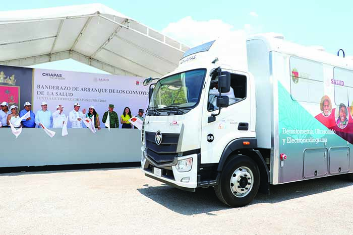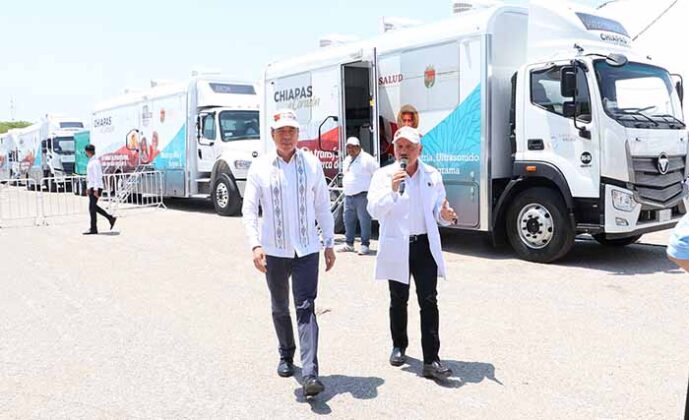 El gobernador Rutilio Escandón Cadenas encabezó el arranque de los Convoyes de la Salud para el fortalecimiento de la atención médica móvil, una estrategia que, dijo, inició con 70 unidades que se duplicaron debido al éxito que la iniciativa ha tenido, principalmente en las comunidades.