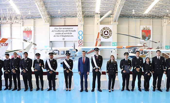 Por su parte, el secretario de Protección Civil, Luis Manuel García Moreno, destacó que este acto marca un hito en la historia de la aviación en Chiapas, toda vez que, gracias a la iniciativa del Gobernador y al apoyo del presidente Andrés Manuel López Obrador, mediante las Becas Benito Juárez se logró consolidar esta primera generación y se refuerza la proyección de recursos humanos altamente calificados, disponibles para operar, administrar y mantener el sistema de transporte aéreo regional, nacional e internacional.