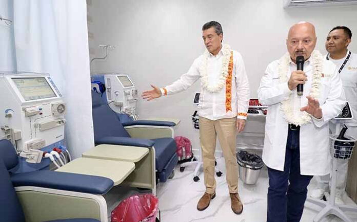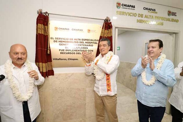 Al inaugurar el servicio de alta especialidad en hemodiálisis del Hospital General Bicentenario de Villaflores, el gobernador Rutilio Escandón Cadenas destacó que es satisfactorio constatar que los recursos públicos se destinan para reconvertir, equipar y mejorar integralmente las unidades médicas, con el objetivo de garantizar el derecho humano de acceso gratuito y universal a este tratamiento, que antes difícilmente se otorgaba a las y los chiapanecos.