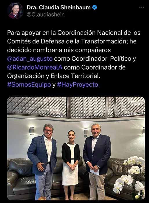 Claudia Sheinbaum Pardo, coordinadora nacional de los Comités de Defensa de la Cuarta Transformación, informó a través de sus redes sociales que el exsecretario de Gobernación, Adán Augusto López Hernández, y el ex coordinador de la bancada de Morena en el Senado, Ricardo Monreal Ávila, se integran a su equipo de trabajo.