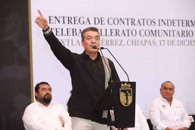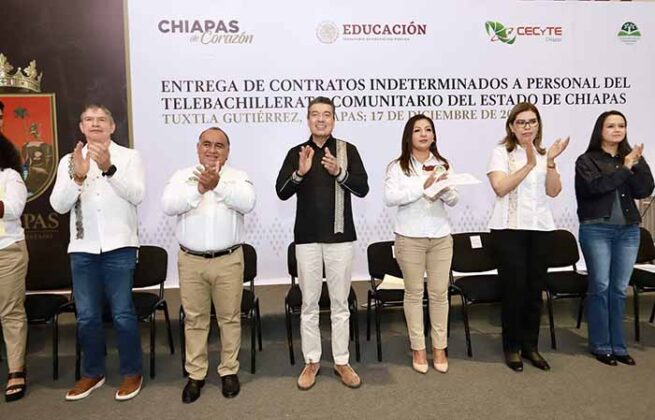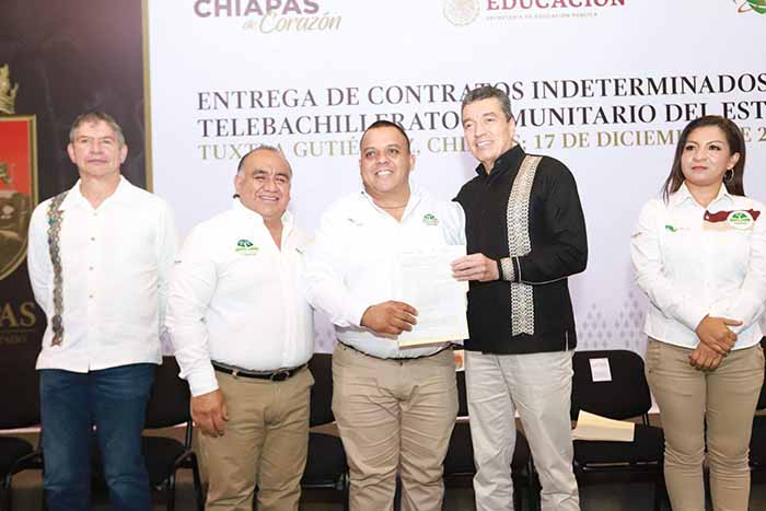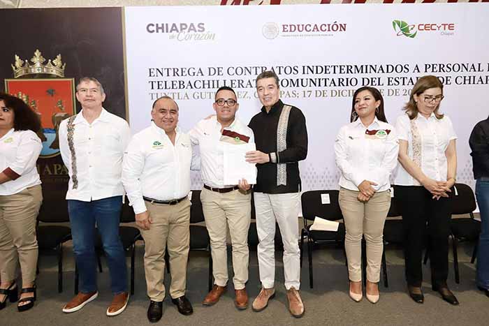 Como un acto de justicia social, el gobernador Rutilio Escandón Cadenas benefició a 695 trabajadoras y trabajadores de 232 planteles del Telebachillerato Comunitario, perteneciente al Colegio de Estudios Científicos y Tecnológicos del Estado de Chiapas (Cecyte Chiapas), con el otorgamiento de contratos indeterminados, en atención a una demanda añeja y como parte de las acciones para dignificar el quehacer académico del magisterio, garantizándoles mejores condiciones laborales.