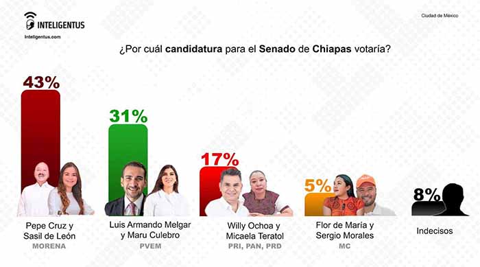 De acuerdo con la encuesta Inteligentus, a la fórmula de Morena conformada por Sasil de León y Pepe Cruz le favorece el 43% de preferencias, seguido de cerca por la fórmula del Verde de Luis Armando Melgar y Maru Culebro con el 31%.