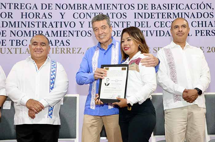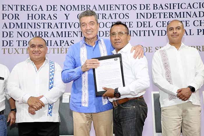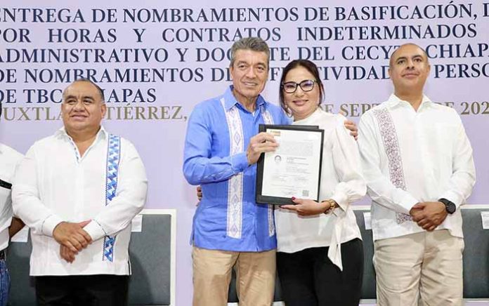 En tanto, el director general del Cecyte Chiapas, Sandro Hernández Piñón, detalló que con la entrega de nombramientos de basificación, nombramientos de definitividad por horas y de contratos indeterminados al personal administrativo y docente de este subsistema educativo y la entrega de nombramientos de definitividad al personal docente de TBC Chiapas, se brinda certeza laboral a quienes por muchos años esperaron este reconocimiento a su desempeño.