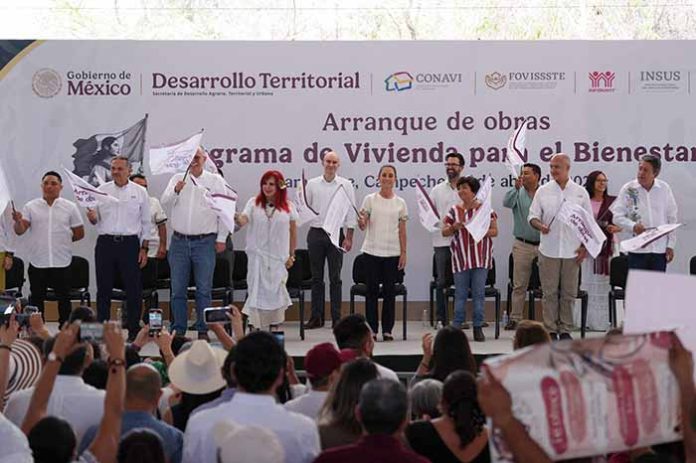 San Francisco de Campeche, Campeche, 27 de abril de 2025.- La Presidenta Claudia Sheinbaum Pardo encabezó el arranque de obras para la construcción de 26 mil nuevas viviendas en Campeche como parte del programa Vivienda para el Bienestar, con lo cual el acceso a un hogar se convierte en un derecho constitucional del pueblo de México, al igual que el resto de los Programas para el Bienestar.