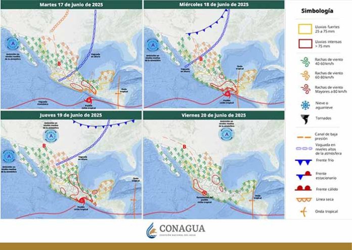 Se pronostican lluvias intensas de 75 a 150 mm en las próximas 24 horas; vientos de 20 a 30 km/h con ráfagas de 40 a 60 km/h y oleaje de 1.5 a 2.5 metros en las costas de la entidad.