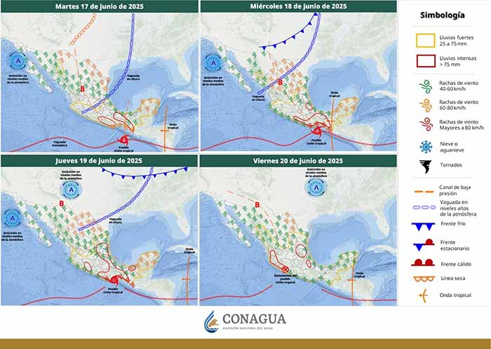 Tuxtla Gutiérrez, Chiapas; 16 de Junio de 2025. El Sistema Estatal de Protección Civil alerta a la población en general ante la presencia del Ciclón Tropical Cinco-E en el Océano Pacífico, el cual podría provocar lluvias y vientos fuertes a partir de este lunes y hasta el miércoles, principalmente en la región Soconusco e Istmo-Costa.