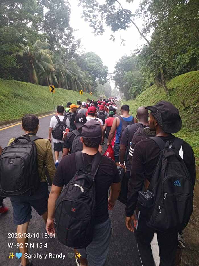 Escuintla, Chiapas; 10 de Agosto del 2025.- Por la tarde de este domingo 10 de Agosto, migrantes de diversas nacionalidades que salieron en caravana desde el pasado miércoles por la madrugada de Tapachula, y recorren la Costa de Chiapas; acordaron seguir su avance por la noche de hoy para intentar salir de territorio chiapaneco en los próximos días, tras descansar dos días en el municipio de Escuintla.
