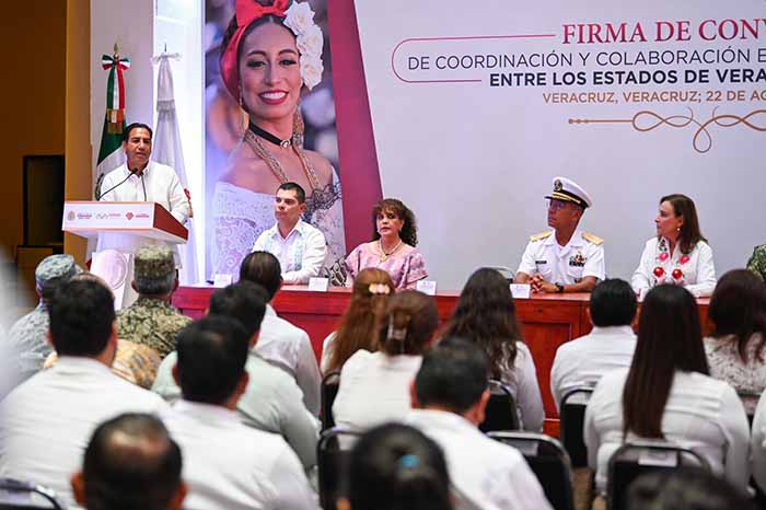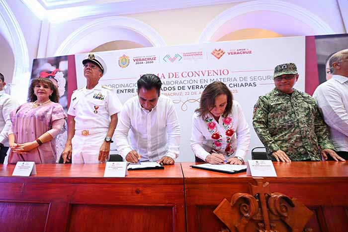 Veracruz, Ver.; 22 de agosto de 2025.- El gobernador de Chiapas, Eduardo Ramírez Aguilar, y su homóloga de Veracruz, Rocío Nahle García, signaron el Convenio de Coordinación y Colaboración en materia de Seguridad, con el propósito de reforzar las estrategias interestatales de prevención, vigilancia y atención ciudadana en beneficio de ambas entidades.