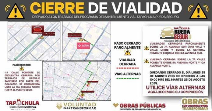 El Ayuntamiento de Tapachula informa a la ciudadanía, que debido a los trabajos de bacheo con concreto hidráulico, permanecerán cerradas parcialmente la 7a. Avenida Sur Par Vial, y Calle Lirios; Avenida Central Poniente esquina con 6a. Avenida Sur. Asimismo, la 7a. Calle Poniente entre 8a. y 10a. Avenida Norte.