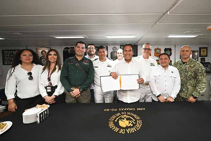 El gobernador Eduardo Ramírez Aguilar, acompañado por el comandante de la 22 Zona Naval, Martín Felipe de Jesús Santillán Murillo, y el comandante interino de la VII Región Militar, Alejandro Vargas González, realizó un recorrido por el buque ARM Chiapas, destinado a labores de patrulla oceánica para proteger la seguridad y la soberanía nacional.