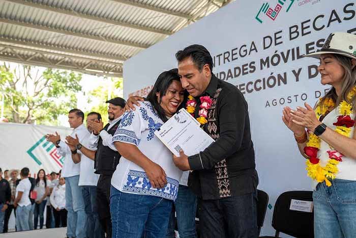 Acompañado de su esposa, Sofía Espinoza Abarca, y sus hijas Renata y Grecia, el mandatario entregó becas Rosario Castellanos y enfatizó que no descansará en su propósito de recorrer, por aire, tierra y agua, todo el estado para llevar el programa de alfabetización Chiapas Puede, el cual se ha posicionado como un referente nacional. Subrayó que la meta es alzar bandera blanca como señal de que todas y todos en Chiapas saben leer y escribir.