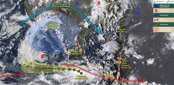 Conagua también advierte sobre viento de 20 a 30 km/h con rachas de 40 a 60 km/h y oleaje de 2.0 a 3.0 metros de altura en costas de Oaxaca y Guerrero.