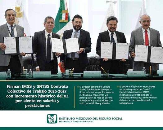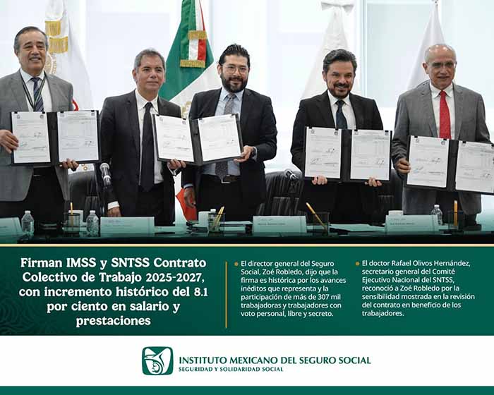 El Instituto Mexicano del Seguro Social (IMSS) y el Sindicato Nacional de Trabajo del Seguro Social (SNTSS) firmaron el Convenio de Revisión Integral del Contrato Colectivo de Trabajo IMSS-SNTSS para el bienio 2025-2027, el cual establece un incremento histórico del 8.1 por ciento en salario y que permite al Instituto mantener su crecimiento en infraestructura, personal y prestaciones.