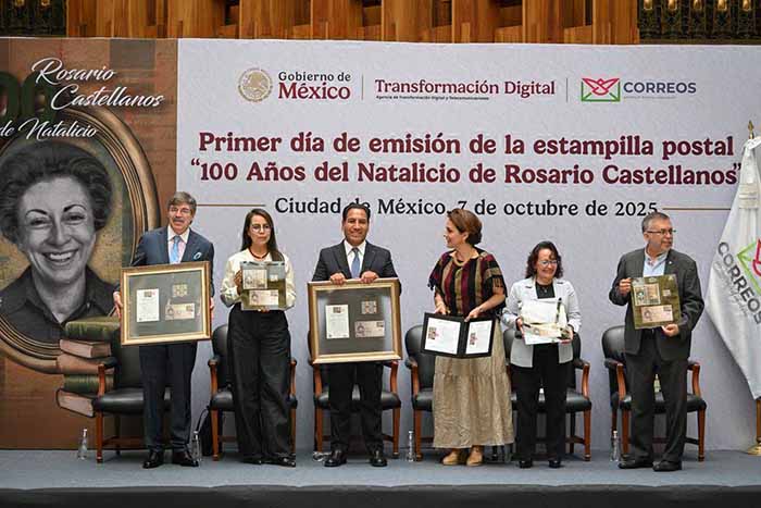 El gobernador Eduardo Ramírez Aguilar asistió como invitado de honor a la ceremonia por el primer día de emisión de la serie de estampillas postales “100 años del Natalicio de Rosario Castellanos”, realizada en el Palacio Postal en la Ciudad de México. En este marco, enfatizó que la destacada escritora y poeta fue una mujer universal, reconocida por su lucha a favor de la liberación femenina, la pluralidad y la apertura del indigenismo mexicano y latinoamericano, así como por su impulso a la alfabetización.