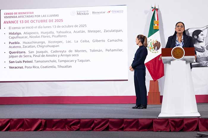 Ciudad de México, 14 de octubre de 2025.- La Presidenta Claudia Sheinbaum Pardo resaltó que se destina toda la fuerza del Estado mexicano para garantizar el apoyo a la población afectada por las lluvias en Veracruz, Hidalgo, Querétaro, Puebla y San Luis Potosí, por lo que reiteró, que no se va a dejar a nadie en el desamparo.