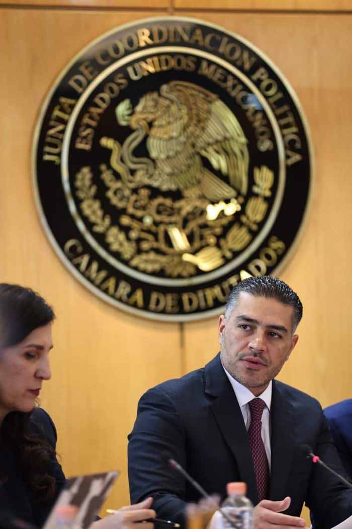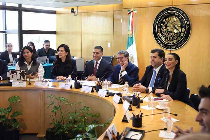 En la reunión participa también la presidenta de la Cámara de Diputados, Kenia López, y los coordinadores de los grupos parlamentarios del PAN, José Elías Lixa; del PVEM, Carlos Puente; del PT, Reginaldo Sandoval; del PRI, Rubén Moreira, y de MC, Ivonne Ortega.