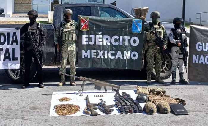 En Ciudad Mier, elementos del Ejército, GN y Policía Estatal liberaron a cuatro personas privadas de la libertad, aseguraron un fusil Barrett, dos armas largas, 39 cargadores, 915 cartuchos, tres chalecos tácticos, dos placas balísticas y un vehículo con reporte de robo.