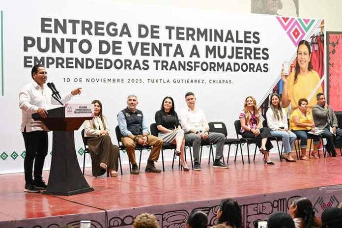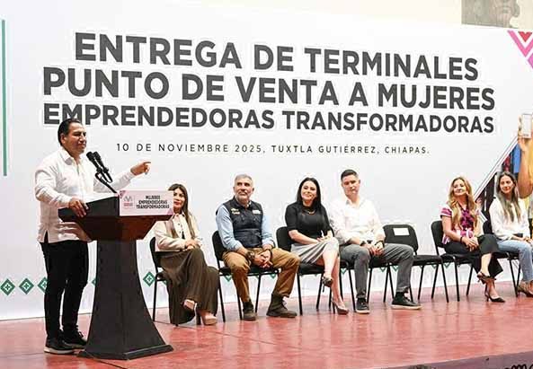 Durante la Entrega de Terminales Punto de Venta a Mujeres Emprendedoras Transformadoras, el gobernador Eduardo Ramírez Aguilar resaltó que su gobierno impulsa la independencia económica de las chiapanecas. Explicó que esta iniciativa busca incorporar el uso de herramientas tecnológicas en los negocios, con el fin de agilizar la comercialización de productos y fortalecer la economía familiar.