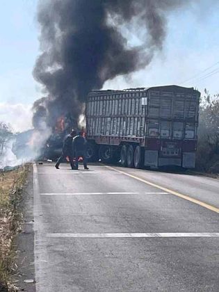 Un segundo incendio se registró cerca de la comunidad Laguna Larga de Cortés, donde un tractocamión fue quemado; además, policías municipales evitaron que otra unidad fuera incendiada tras escuchar disparos en la zona.