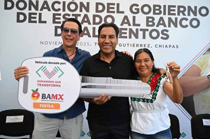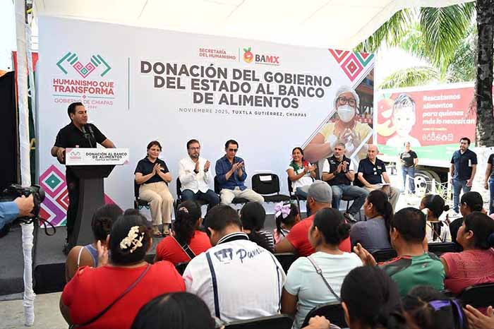 El gobernador Eduardo Ramírez Aguilar encabezó el acto de donación de un vehículo de carga al Banco de Alimentos de México A.C. (BAMX) en Tuxtla Gutiérrez, donde reafirmó su respaldo a los organismos y asociaciones civiles que trabajan con amor y humanismo para apoyar a la población, especialmente a quienes se encuentran en situación de mayor vulnerabilidad.