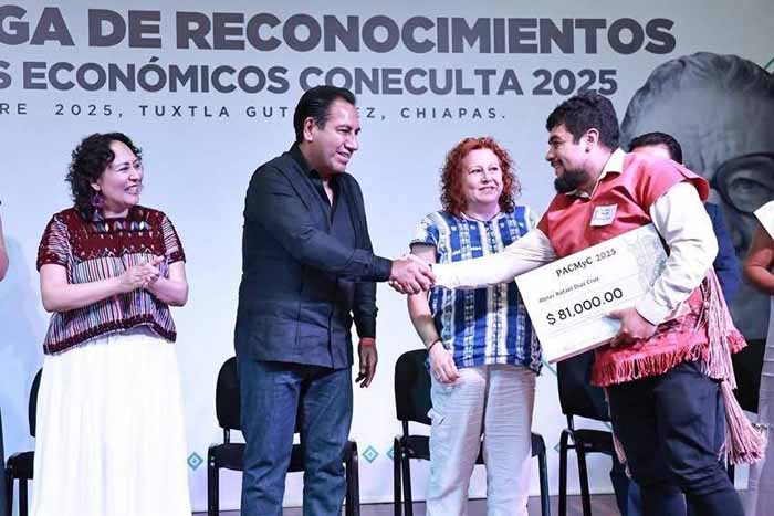 Asimismo, se otorgó el Premio Internacional de Poesía Jaime Sabines 2025 a Julio César Melo Toledo por el poemario inédito Botánica Forense. En lo que respecta al Pacmyc, emisión 2025, se benefició a Aracelis Montero Zambrano, representante del proyecto Elaboración y Exposición de Muñecas de Jolochi, del municipio de Villaflores; a Pablo Rafael Díaz Cruz, representante del Proyecto Museo Itinerante de Textil de los Altos de Chiapas, de Zinacantán; y a Candelaria Vázquez Morales, con el proyecto PtetChulel, rescate de las técnicas ancestrales del algodón en los huipiles de Venustiano Carranza. Boletín Oficial
